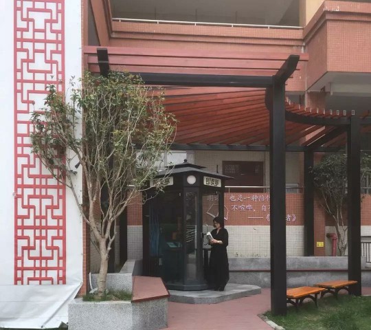 朗讀亭,座落在學(xué)校科學(xué)樓前的東邊草坪邊上,外形似復(fù)古電話亭,溫暖大氣,讓人神往。它占地約2平方米,可謂麻雀雖小五臟俱全——專業(yè)的音響系統(tǒng)、電子屏幕、氛圍燈光一應(yīng)俱全,系統(tǒng)自帶大量的數(shù)字朗讀資源:每學(xué)期必讀書籍中的某些篇章或古詩詞,語文教材中的某篇課文及節(jié)選,以及教育部推薦的網(wǎng)絡(luò)閱讀平臺中的中華經(jīng)典等多種類型的書目供選擇。每位朗讀者進(jìn)門后對著麥克風(fēng)就可以開始朗讀自己心目中的好文章。