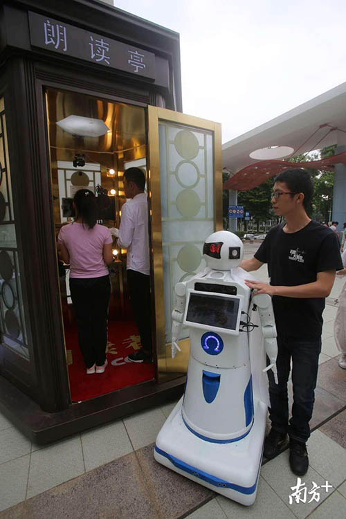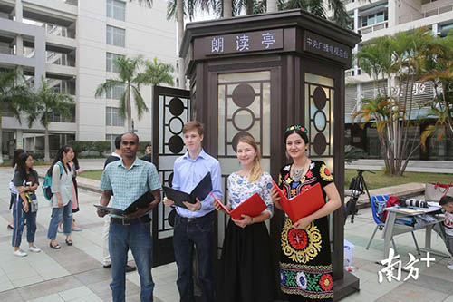 來到朗讀亭的有華工離體老教授,現(xiàn)任校領(lǐng)導(dǎo),中外在校生,華工研制的機(jī)器也進(jìn)亭朗讀了。