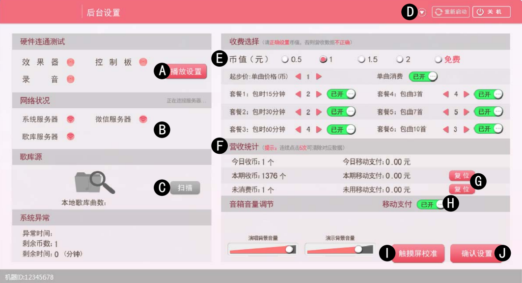 迷你ktv房收費(fèi)多少錢一首歌設(shè)置_迷你ktv房調(diào)節(jié)音量,可以在通過按控臺(tái)左上角的“功能”按鍵進(jìn)行操作,3秒內(nèi)按下投幣門上的“測(cè)試”鍵進(jìn)入;退出時(shí),按觸摸屏上的返回按鈕退出。當(dāng)日營(yíng)收統(tǒng)計(jì)時(shí)間段:6:00AM-(第二天)6:00AM。