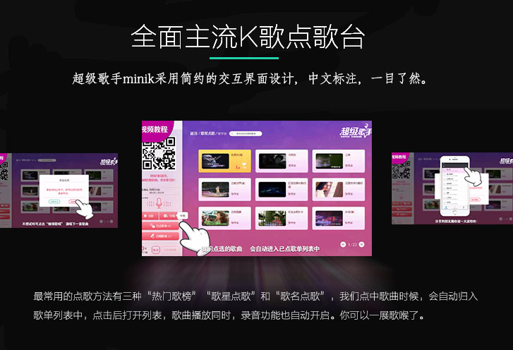 老少皆宜的觸屏式操作點歌界面、歌星、分類等點歌方式一觸即達帶來非凡的視覺易用體驗。